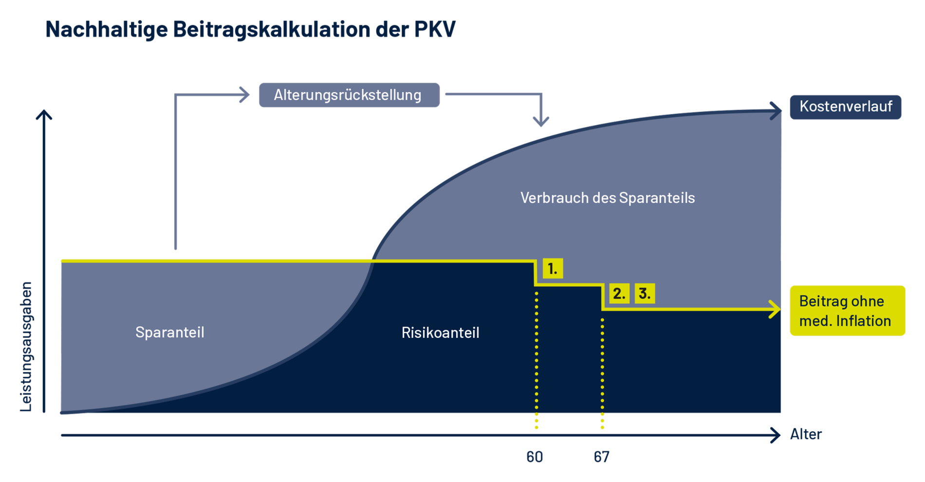 Das PKV-Kalkulationsmodell berücksichtigt insbesondere die tendenziell höheren Gesundheitsaufwendungen im Alter. In den jüngeren Lebensjahren werden daher größere Teile der Beiträge als Alterungsrückstellungen angelegt, um die späteren höheren Ausgaben abzudecken und die Beitragsentwicklung zu dämpfen. Die Anzahl der Neuzugänge in den Versicherungstarifen hat keinen Einfluss auf diese langfristige Vorsorge.