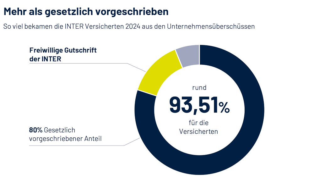 Die INTER legt großen Wert darauf, ihre Kunden finanziell zu entlasten. Während private Krankenversicherer gesetzlich verpflichtet sind, mindestens 80% ihrer Unternehmensüberschüsse an die Versicherten zurückzugeben, geht die INTER noch weiter: Im Jahr 2024 gibt sie 93,51% ihrer Überschüsse an ihre Kunden weiter.